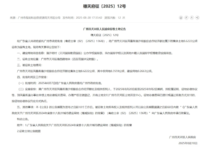 8月20日,广州市规划和自然资源局发布了一则广州市天河区人民政府征收土地公告。